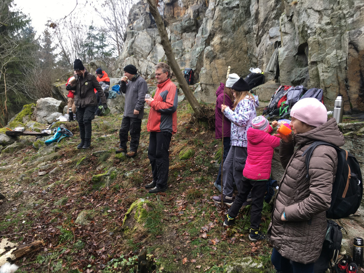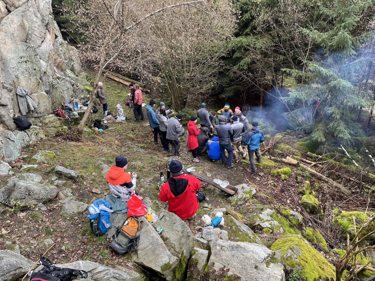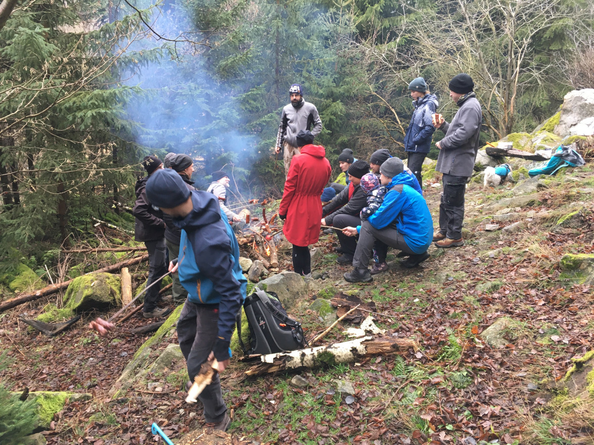 Poté, co jsme dorazili ke skále opět následoval zažitý scénář. Jak se již okázalo na řadě akcí, mnozí z oddílu se pomalu ale jistě adaptují z lezců na dřevorubce. Nikoho jsem předem nešacoval, ale překvapilo mě, kolik lidí z různých částí oděvů a batohů začalo vytahoval pily. Než jsme se nadáli, stála před námi hranice dřeva. Jelikož počasí této tradiční akci tradičně přálo, dřevo mělo nepatrně vyšší vlhkost, než je pro dosažení teploty hoření žádoucí. Proto asi nikoho opět nepřekvapilo, že prvních pár hodin oheň odpařoval vodu z vody, která vypadala jako dřevo. Ale nakonec se všem podařilo osáhnout kýženého bodu RšnK*.