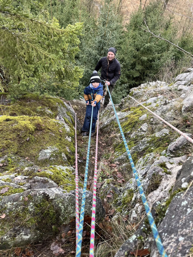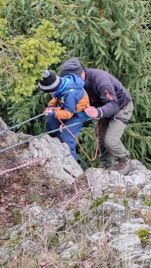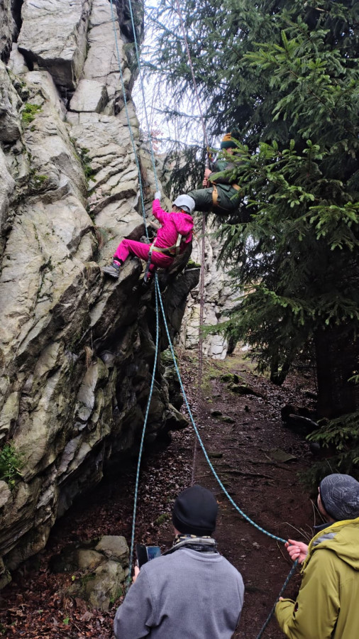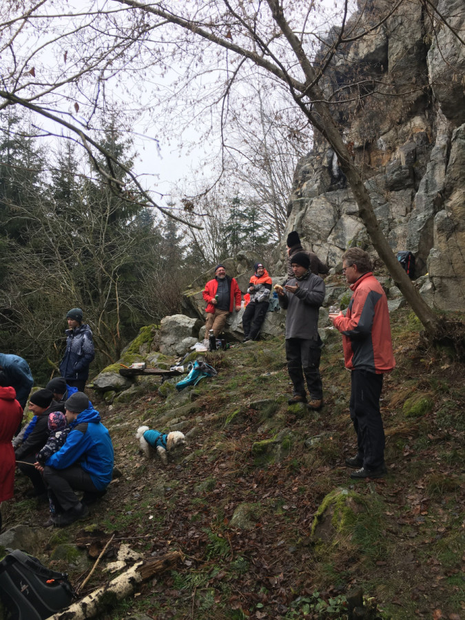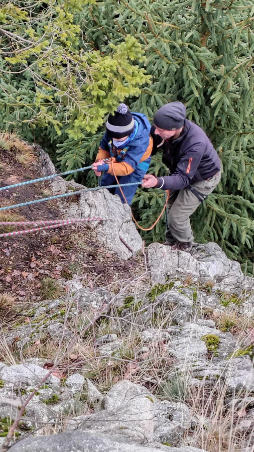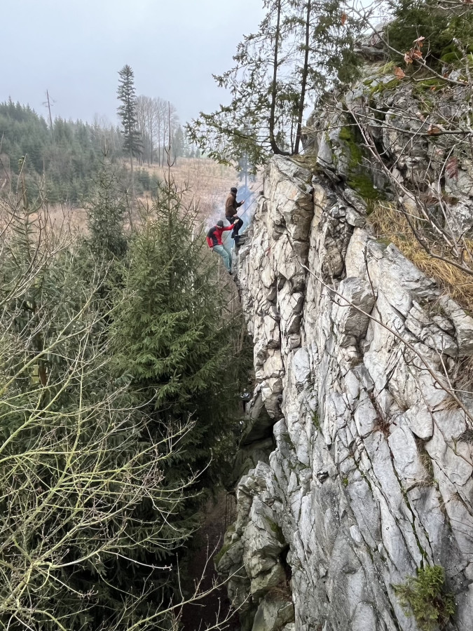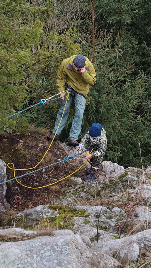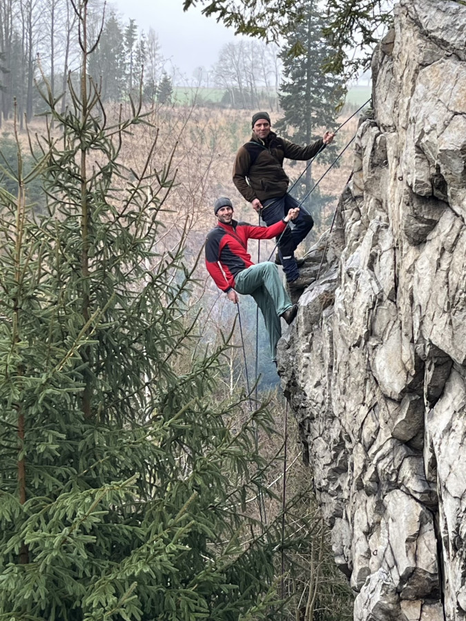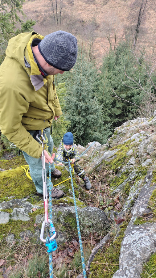 Posilněni obědem, lihovinou či jinou pochutinou jsme se vydali splnit naše poslání a provést čestný akt slanění bez pomůcek ku slanění. Mám na mysli klasickou technikou, kterou nám zanechal slavný horolezec a klavírista Hanz Dülfer před zhruba 120 lety. Nutno dodat, že řada účastníků toto metodu slanění nepoužívá a volí dnes zaběhnutou metodu slanění v domnění, že jde o bezpečnější způsob. Pro tyto kverulanty jsem maličko zapátral v historii a přikládám tento výňatek z textu: Jedním z jeho vynálezů je tak zvaný Dülferův sed. Je to slaňovací technika, která navázala na dřívější metody, ale učinila slaňování daleko bezpečnějším.