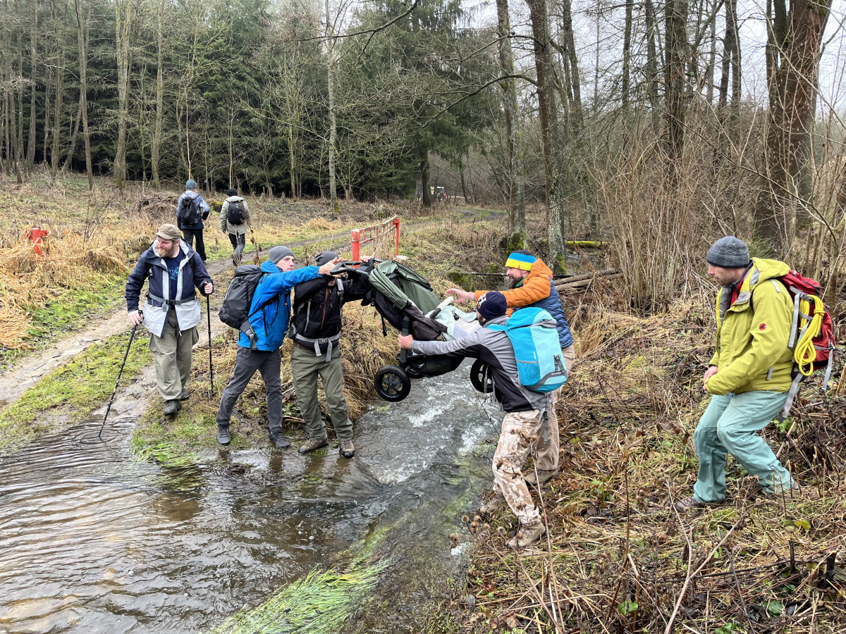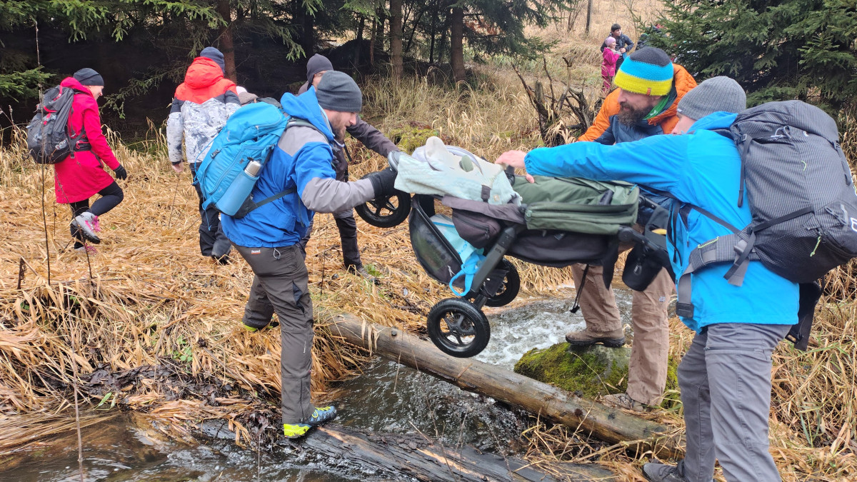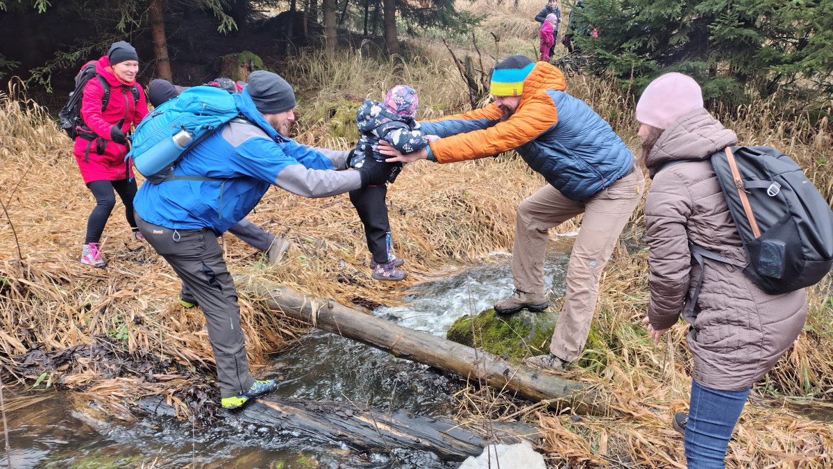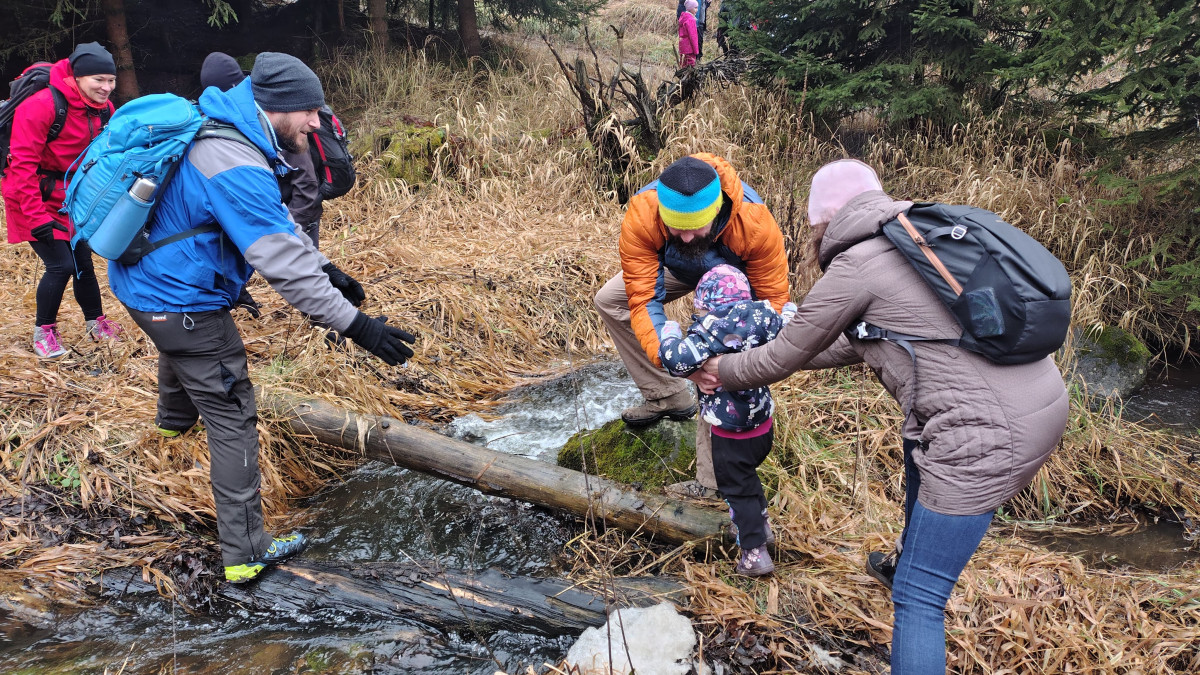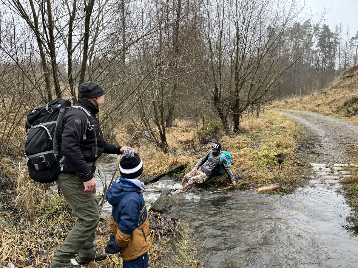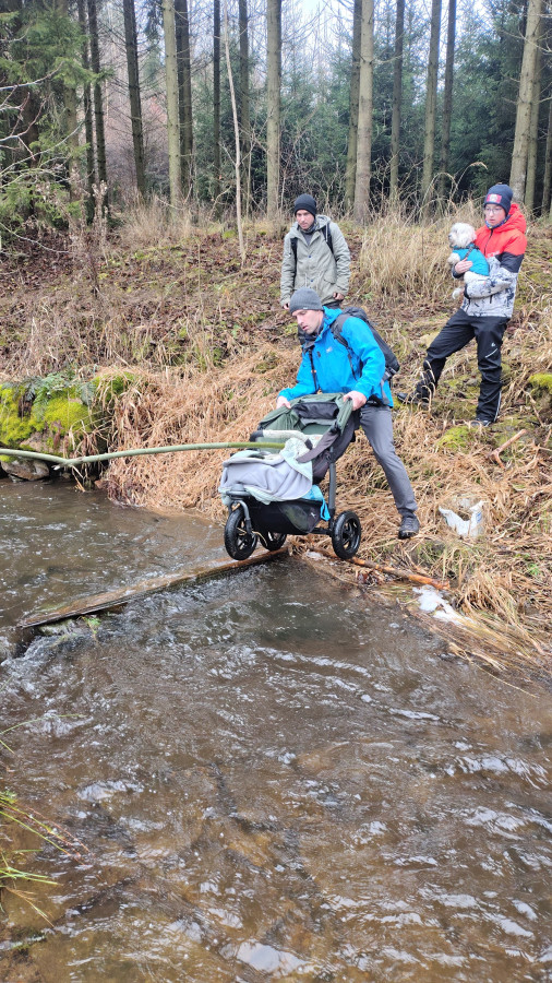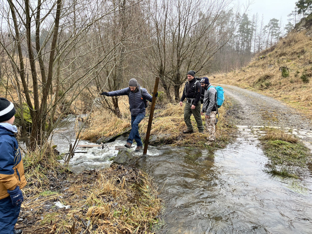 Dále cesta probíhala v klasickém scénáři pěšky směr Bílá skála, nebo jak se vlastně cíl naší cesta jmenuje. Jde v podstatě o nudný rodinný výlet pouze symbolicky zpestřený třemi brody přes cestu. Na brodech je zvláštní asi jen fakt, že nejdou přebrodit. Tudíž je potřeba vždy zapojit vlastní tvořivost, hbitost a odvahu ve snaze rozvodněný tok překonat suchou nohou, lépe však celým tělem. To se naštěstí všem, včetně dětí, kočárků a psů, kteří byli přes vodu vrženi podařilo. Nepočítám pana Karla K., který se na této cestě koupe tak rád a často, že už jeho lehké namočení do půli stehen nelze považovat za omyl, či dokonce nehodu. Jak jinak si vysvětlit, že jediný skutečný reprezentant oddílu v disciplíně skok o tyči této metodě překonání vody podlehl, zatímco ostatní amatéři ji absolvovali se suchými botami i trenýrkami.